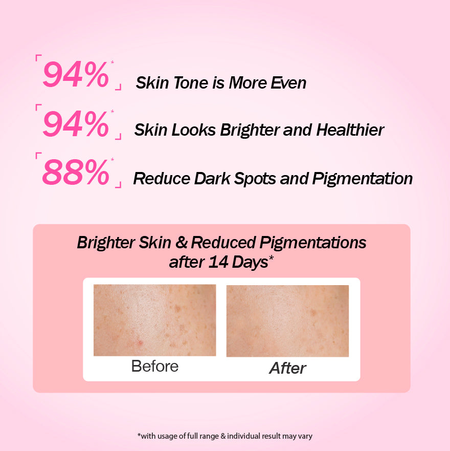 Satu essens yang sangat pekat diformulasikan dengan 5x Vita-Biotic Glow Complex yang diperkaya dengan Prebiotik semulajadi, Vitamin C, AHA semulajadi, Bunga Bintang Jeju dan ekstrak Laricyl untuk mengetatkan pori-pori dan mengurangkan pembentukan bintik gelap dan pigmentasi. Kulit menjadi bersinar, licin dan lembut dengan tona kulit yang sekata.
